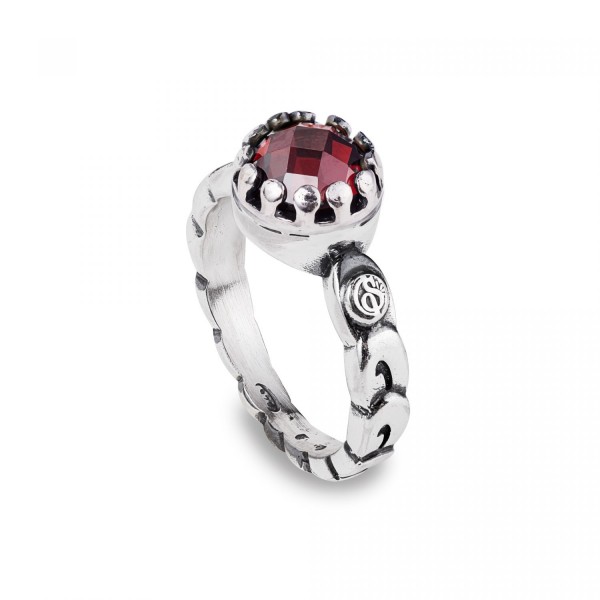 Anello in Argento 925/000 con Pietra centrale Cubic Zirconia sfaccettata. Iride, la dea Greca dell'arcobaleno rivive attraverso questa collezione di gioielli colorati e finemente cesellati a mano con simboli della cultura magnogreca, come la greca, motivo decorativo in uso nell'antica Grecia, impressa sul gambo dell'anello.
