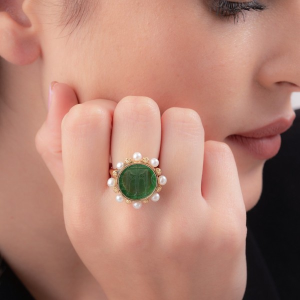 Anello in oro 9 kt con pasta vitrea taglio tondo contornata da perle. Sulla pasta vitrea è inciso il tripode, legato ad Apollo delfico e ai miti della fondazione della città di Kroton, icona della Magna Grecia.Diametro 2 cm