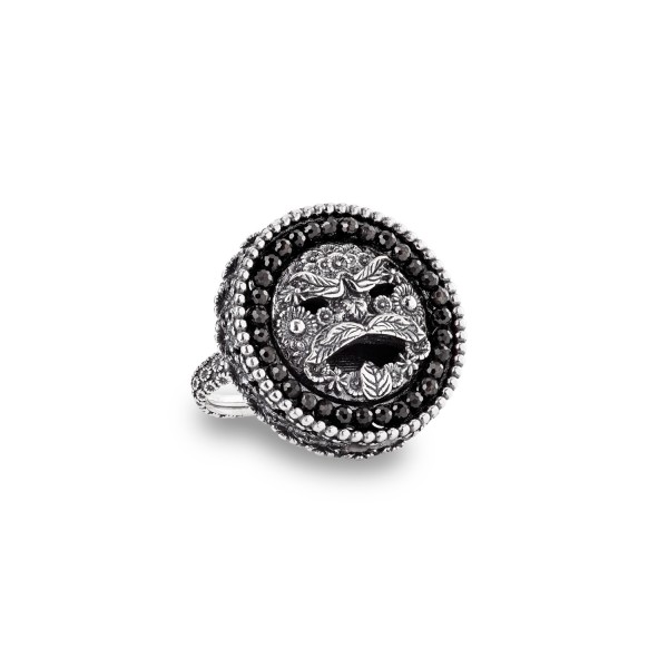 Anello Gerardo Sacco, in argento 925/000 con maschera Arcimboldo, pietre Cubic Zirconia di colore nero e gambo decorato con elementi floreali. Diametro 1,7 cm