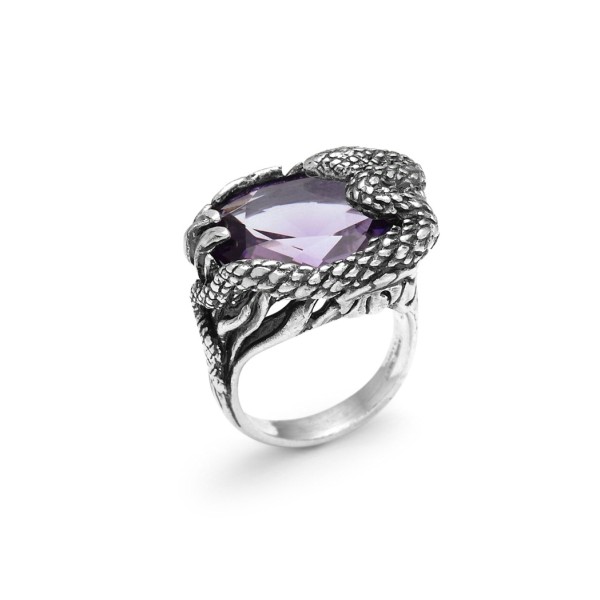 Un grande quarzo ovale color ametista è il protagonista di questo anello iconico, insieme al serprente in argento che, maestoso, sopra vi si adagia. La pietra è abbracciata da un castone in guisa di grandi foglie esotiche, sempre modellate nell'argento fuso a cera persa. Un piccolo capolavoro realizzato a mano in azienda.