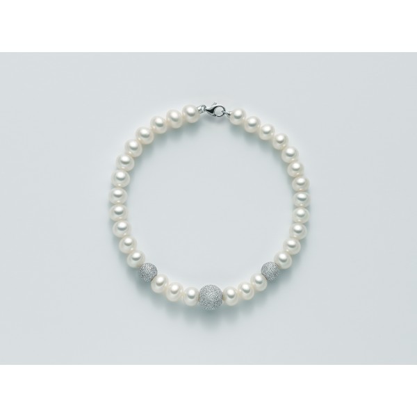 Bracciale Miluna in perle della collezione i bracciali portafortuna, con perle dal diametro 5,5-6 ,con 3 sfere diamantate in oro bianco, la centrale ha diametro 7 mm e le laterali di 5 mm , lunghezza del bracciale è di 19 cm. Si allegano astuccio ,garanzia e shopper lusso.