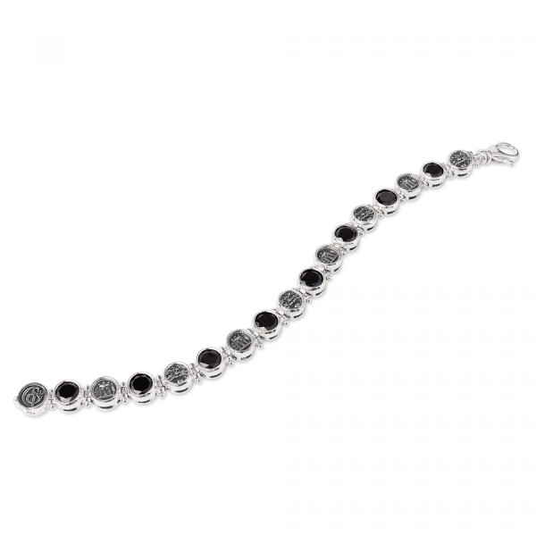 Bracciale tennis in argento 925/000 con pietre cubic zirconia sfaccettate, alternate con maschere e monete, simboli della Magna Grecia. Iride, la dea greca dell'arcobaleno rivive attraverso questa collezione di gioielli colorati e finemente cesellati a mano con simboli della cultura magnogreca, come la maschera apotropaica, simbolo propiziatore di fortuna e felicità.Il bracciale è lungo 20 cm. Si allegano garanzia,astuccio e shopper