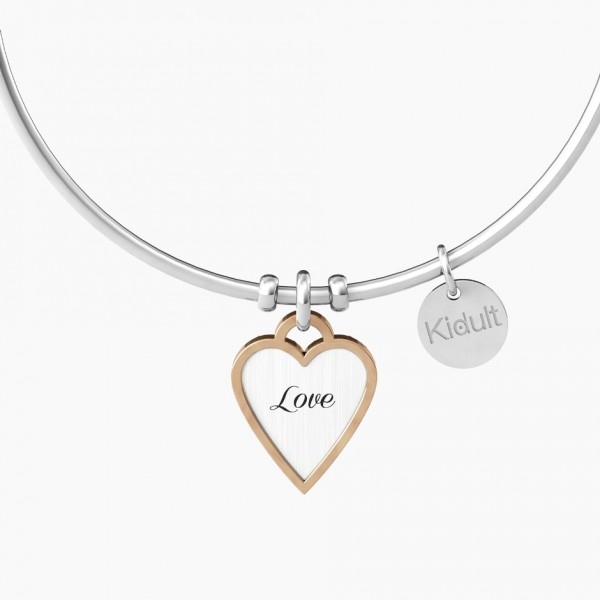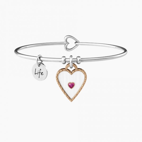 Bangle in acciaio con ciondolo satinato a cuore allungato e zircone a cuore, con raggi di luce.