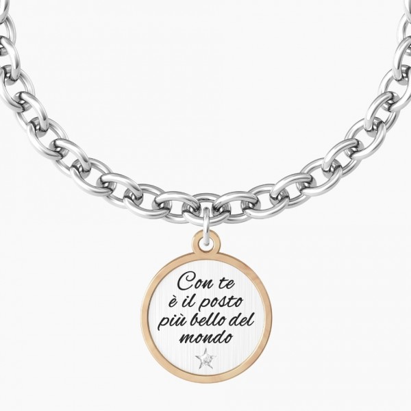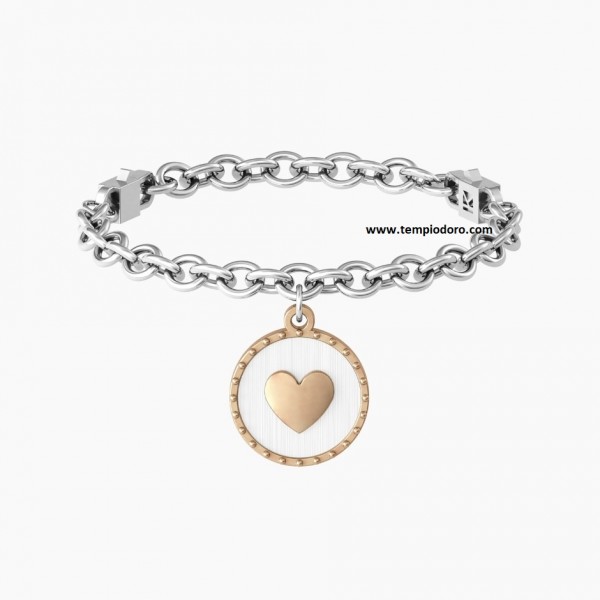 Bracciale in acciaio con catena rolò "comfort fit" e ciondolo satinato tondo con rifinitura borchiata e cuore in rilievo color oro rosa.