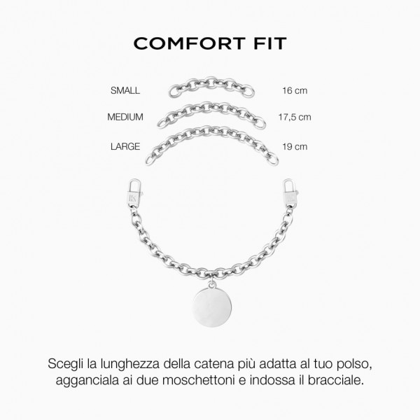 • Il sistema "comfort fit" permette facilmente di adattare in modo confortevole ed elegante il bracciale al tuo polso. Scegli la lunghezza della catena più adatta al tuo polso, agganciala ai due moschettoni e indossa il bracciale.