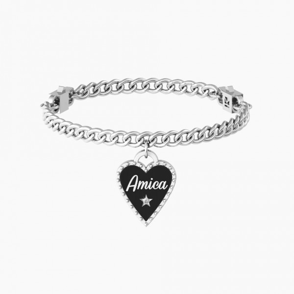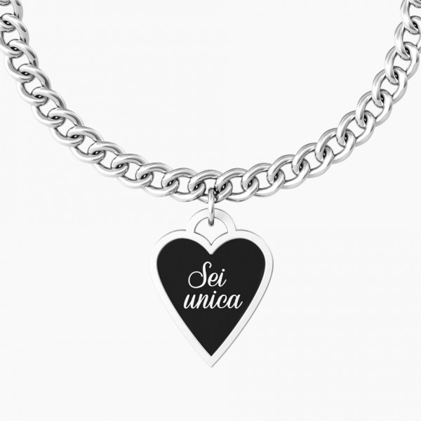 Bracciale in acciaio con catena groumette "comfort fit" e ciondolo nero satinato a cuore con rifinitura borchiata e cristallo.