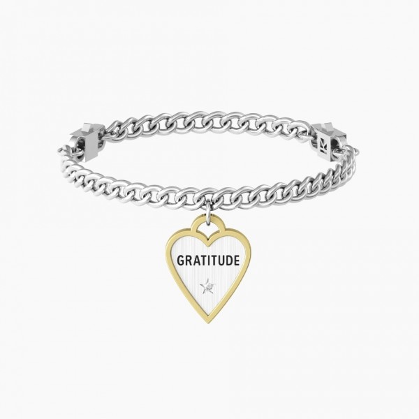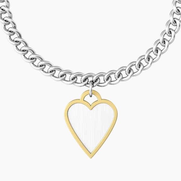 Bracciale in acciaio con catena groumette "comfort fit" e ciondolo satinato a cuore con rifinitura color oro giallo e cristallo.