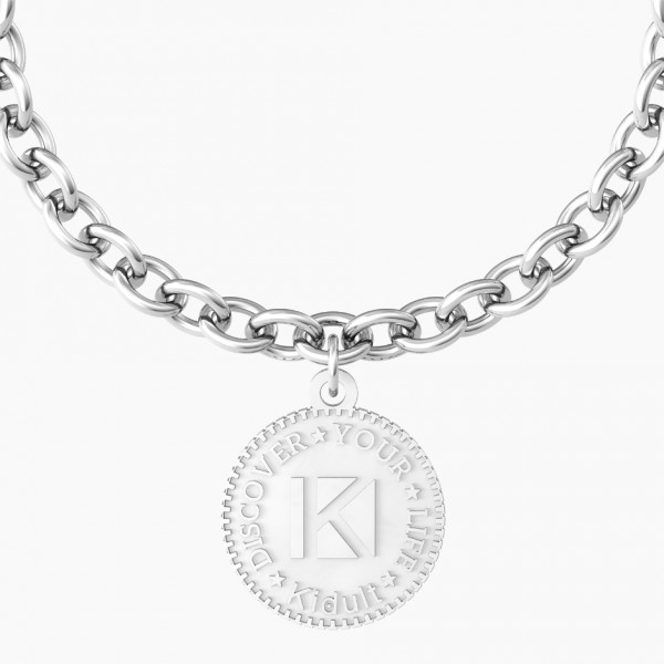 Bracciale in acciaio con catena rolò "comfort fit" e ciondolo lucido a forma di moneta.