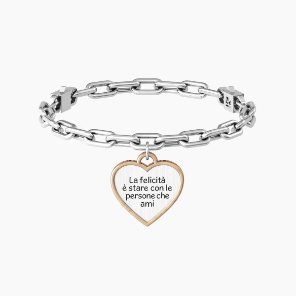 Bracciale in acciaio "Comfort fit" con catena a maglie ovali e ciondolo satinato a forma di cuore con rifinitura color oro giallo, cristallo e frase "La felicità è stare con le persone che ami".