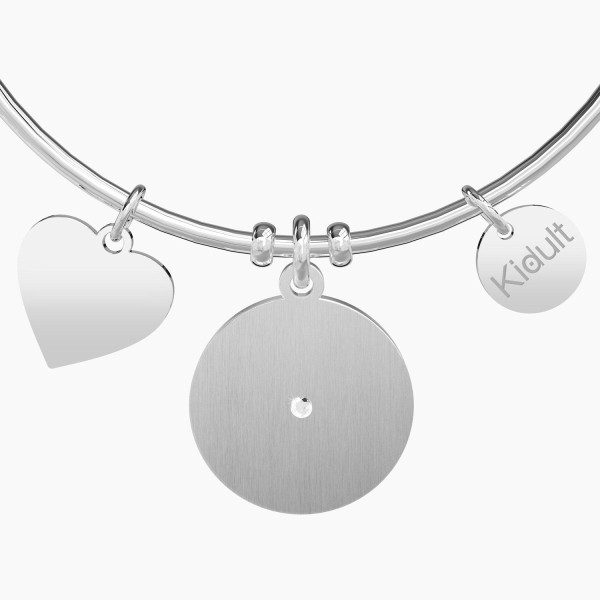 Bangle in acciaio con ciondolo tondo satinato con scritta "There's always a rainbow at the end of every rain" e ciondolo a forma di cuore smaltato con colori dell'arcobaleno.