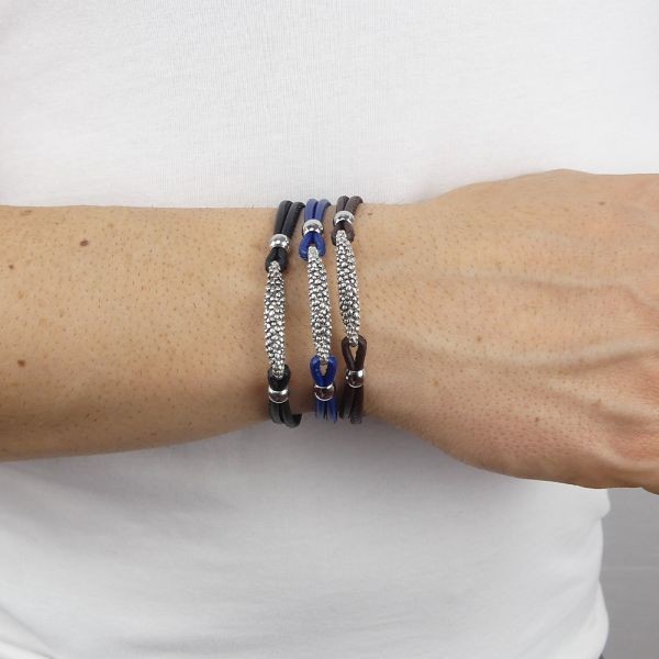 Bracciale Boccadamo doppio filo di pelle di colore nero e barretta pallinata. Realizzato in argento brunito tiolo 925 . Lunghezza 21.5 cm.