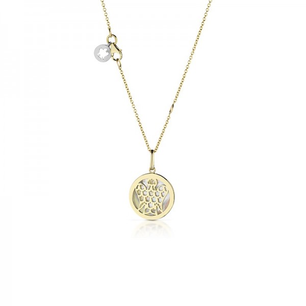 Collana in oro giallo con pendente double face, angelo e cuore traforati con madreperla - lunghezza catena 40/45 cm - diametro pendente: 1,68 cm.Si allegano Garanzia,libretto del tuo angelo custode,Garanzia e shoerr luxury.