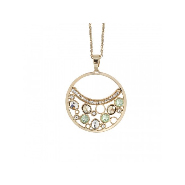 Collana doppio filo in bronzo placcato oro giallo con pendente circolare (diametro cm 4, lunghezza cm 5), decorato da cristalli Swarovski crystal, ametyst e light ametyst. Lunghezza cm 38, estendibile fino a cm 43,5. Si allegano,astuccio,garanzia e shopper lusso