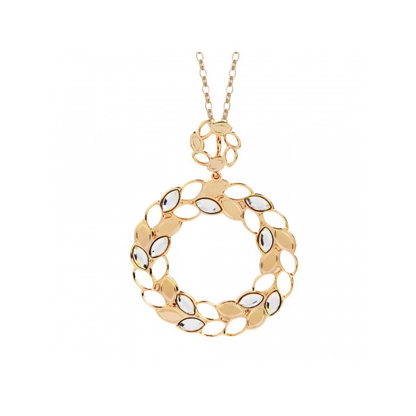 Collana in bronzo placcato oro giallo con contromaglia (diametro cm 1,5) e pendente circolare (diametro cm 4) dal decoro a spiga di grano e cristalli Swarovski crystal (lunghezza cm 5,5). Duplice indosso: 1 filo cm 80 / 2 fili cm 40. Si allegano astuccio,garanzia e shopper lusso