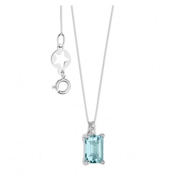 Collana Comete Gioielli, collezione Fantasia di colore, in Oro bianco 750,con Acquamarina taglio baguette, CT 0.90 e Diamanti taglio brillante Ct 0.02 colore G purezza SI. Lunghezza collana 42 cm.