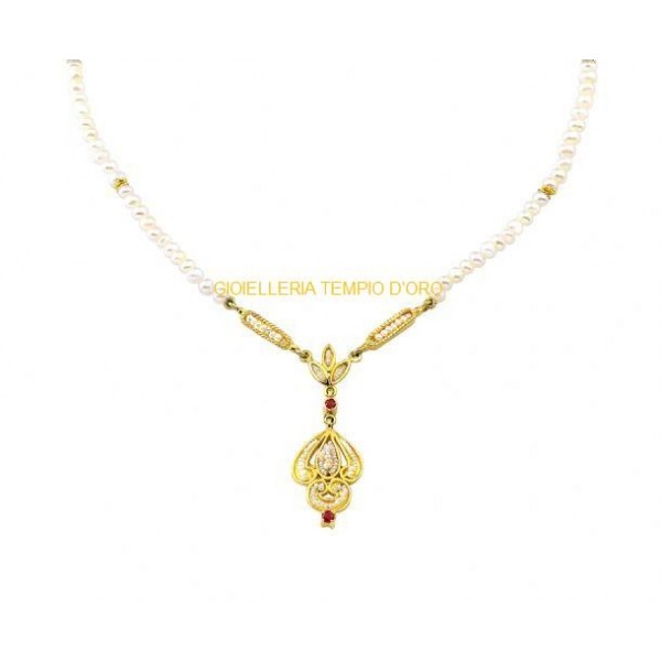 Collana oro 18kt con perle e rubini 14144