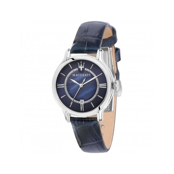 Orologio Maserati donna collezione Epoca. Modello Con Cassa in acciaio Lucido , Del Diametro Di 34 Mm E Delle Dimensioni Di 34 X 41 Mm. Il Quadrante È di Colore blu scuro con Vetro Minerale e Cinturino in pelle blu con chiusura deplaiant ,water resistant 10 ATM. Si allegano 24 mese di garanzia, istruzioni, astuccio e shopper lusso