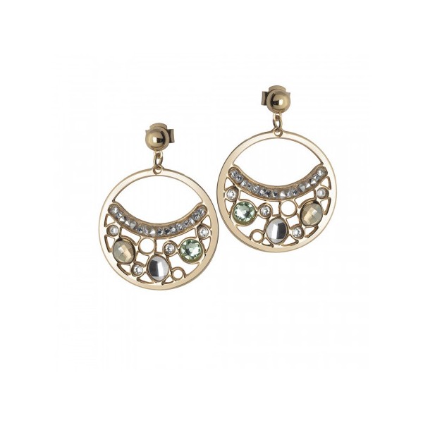 Orecchini in bronzo placcato oro giallo con perno a farfalla e pendente a cerchio (diametro cm 3), decorato internamente da cristalli Swarovski crystal, chrysolite e gold. Lunghezza cm 4. Si allegano astuccio,garanzia e shopper lusso.