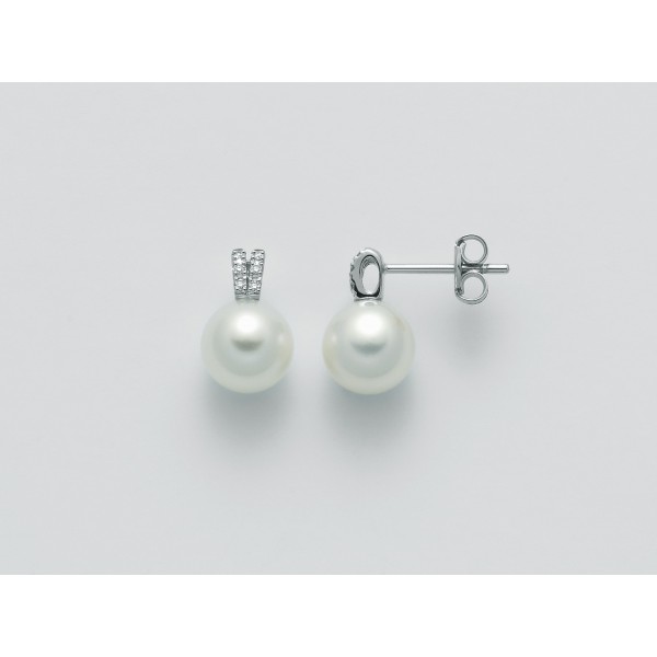 Orecchini Miluna collezione parure perle, in oro 750/1000 KT 18, con 12 diamanti naturali, CT 0,048 , taglio brillante, colore G purezza SI, numero 2 perle bianche, rotonda acqua dolce, diametro 7,5-8. Sistema di lavorazione microfusione.