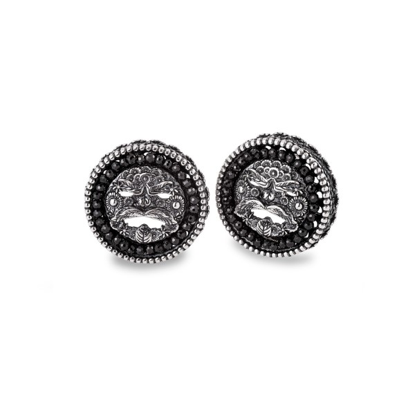 Orecchini Gerardo Sacco, a lobo in argento 925/000 con maschera dell'Arcimboldo e Cubic Zirconia di colore nero. Diametro 1,7 cm