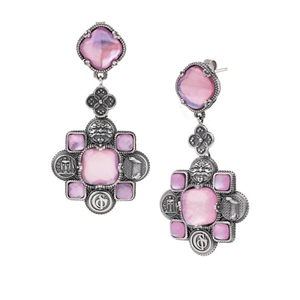 Orecchini Gerardo Sacco pendenti, dall’accattivante linea geometrica. I colori sfaccettati delle pietre sapientemente alternati ai simboli della Magna Grecia.