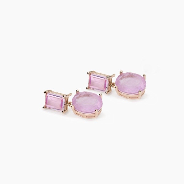 Orecchini da donna in argento placcato oro rosa con glass rosa taglio baguette, pendente in fusion stone di glass rosa e cristallo di rocca taglio ovale.