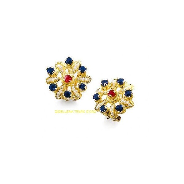 Orecchini Gerardo sacco,chiusura clips con paletto perle naturali coltivate di acqua dolce,oro 750% 18 KT,rubini e zaffiri blu 14095