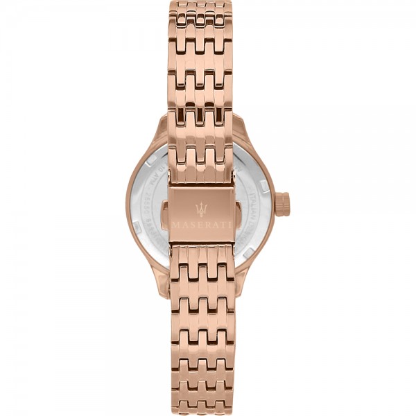 Orologio donna Maserati traguardo,solo tempo con calendario alle ore 6,cassa 32 mm, in acciaio lucido di colore rosé,quadrante in madreperla di colore principale bianco e contornata di cristalli swarovski di colore bianco e blu,corona a vite,vetro minerale,chiusura folfer Buckle,fondello a vite, water resisten 10 ATM.
