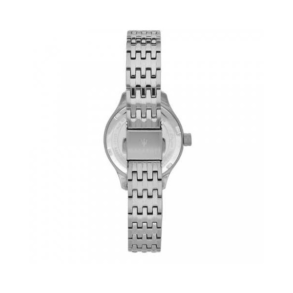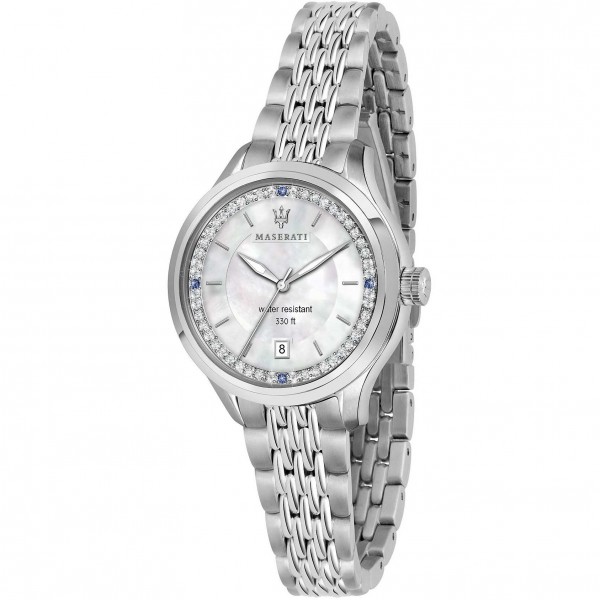 Orologio donna Maserati traguardo,solo tempo con calendario alle ore 6,cassa 32 mm, in acciaio lucido,quadrante in madreperla di colore principale bianco e contornata di cristalli swarovski di colore bianco e blu,corona a vite,vetro minerale,chiusura folfer Buckle,fondello a vite, water resisten 10 ATM.