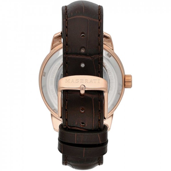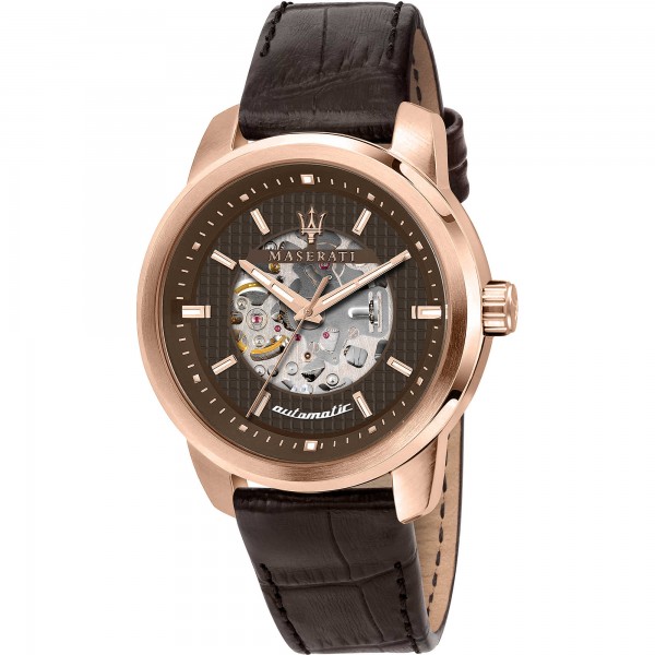 Orologio Maserati solo tempo automatico da uomo, cassa 44 mm in acciaio rosè,quadrate marrone con indici,cinturino in pelle ,vetro minerale,fondo a vite ,water resistant 5 ATM. Si allegano,garanzia 24 mesi,istruzioni,astuccio e shopper lusso.