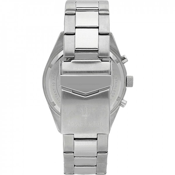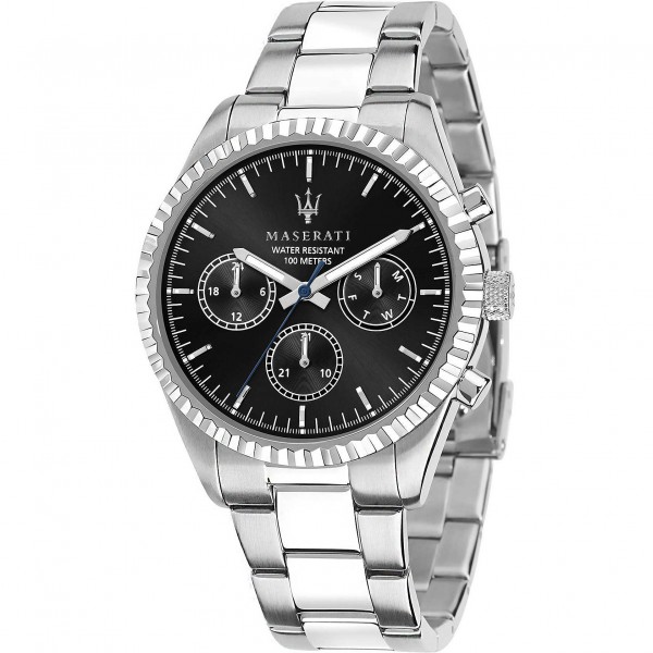 Orologio Maserati multifunzione, da uomo, cassa 43 mm in acciaio ,quadrante nero con indici,cinturino in acciaio ,vetro minerale,corona a vite,fondo a vite ,water resistant 10 ATM. Si allegano,garanzia 24 mesi,istruzioni,astuccio e shopper lusso.