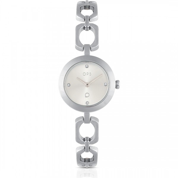 Orologio solo tempo da donna,Ops Objects collezione love chain,cassa realizzata in metallo, quadrante sunray con cristalli di colore argento e fondello in acciaio,citurino con catena sfaccettata in metallo di colore argento. Dimensione cassa 28 mm, water esistent all'acqua 3 atm.