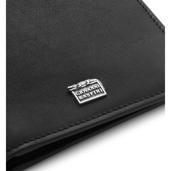 liscio nero. Giovanni Raspini, sempre alla ricerca dell'eccellenza artigianale, impreziosisce il prodotto con un iconico elemento in Argento 925, realizzato tramite fusione a cera persa, che raffigura il logo del brand in miniatura sormontato dal caratteristico coccodrillo. Il modello offre 8 scomparti per carte, 2 tasche aggiuntive per documenti vari e 2 ampi scomparti centrali per le banconote. Lavorato interamente a mano in Toscana. Dimensioni 11x10 cm.