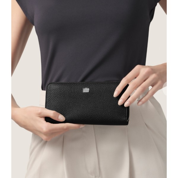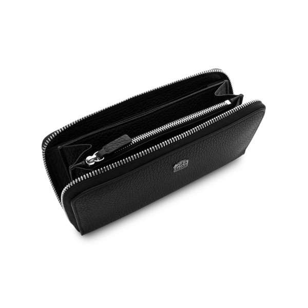 Un grande portafoglio, realizzato in pregiata pelle di vitello goffrata nera, che unisce design e funzionalità. Il modello offre 12 scomparti portacarte, una spaziosa tasca portamonete con chiusura a zip, 3 tasche per banconote e 3 scomparti a soffietto pensati per documenti e ricevute. Una cerniera che percorre tutto il perimetro del portafoglio consente una chiusura sicura ed elegante. Questo prodotto rappresenta la massima eccellenza artigianale che da sempre contraddistingue il brand Giovanni Raspini, ed è impreziosito da un caratteristico elemento in Argento 925, realizzato in fusione a cera persa e raffigurante il logo del brand in miniatura, sovrastato dall'iconico coccodrillo. Lavorato interamente a mano in Toscana.