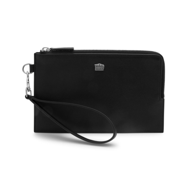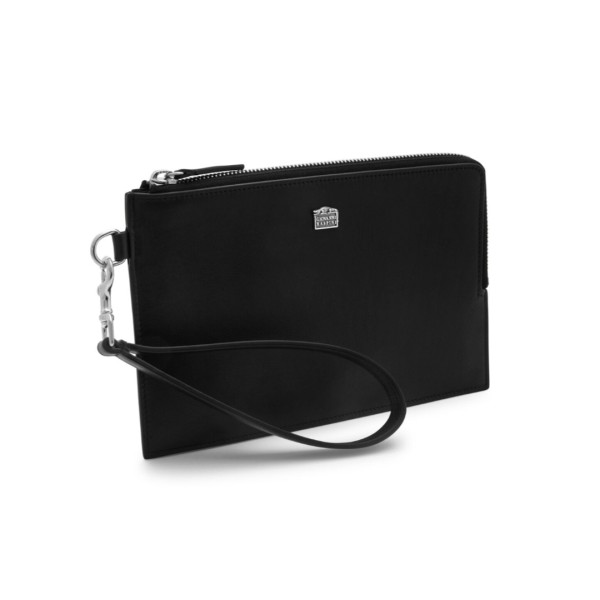 Realizzato in pregiata pelle di vitello pieno fiore liscia nera, questa pouch è il modello più grande della collezione, versatile e ideale per chi desidera spazio senza rinunciare allo stile. La pouch, dotata di un comodo laccio da polso staccabile in pelle e metallo, si chiude con una robusta cerniera, la quale garantisce che tutti gli oggetti contenuti siano al sicuro. All'interno è presente un unico grande scomparto, munito di 3 tasche aggiuntive per carte di credito. Questo prodotto rappresenta la massima eccellenza artigianale che da sempre contraddistingue il brand Giovanni Raspini, ed è impreziosito da un caratteristico elemento in Argento 925, realizzato in fusione a cera persa e raffigurante il logo del brand in miniatura, sovrastato dall'iconico coccodrillo. Lavorato interamente a mano in Toscana.