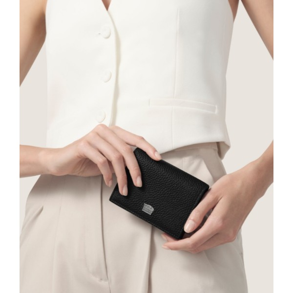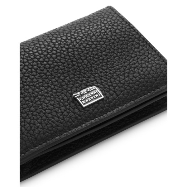 Un portafoglio spazioso e compatto, in pregiata pelle di vitello goffrata nera, dotato di una chiusura a bottone a pressione e 5 scomparti per carte di credito. La tasca portamonete a soffietto, munita di chiusura a zip, include sull'altro lato una tasca nascosta. Questo prodotto rappresenta la massima eccellenza artigianale che da sempre contraddistingue il brand Giovanni Raspini, ed è impreziosito da un caratteristico elemento in Argento 925, realizzato in fusione a cera persa e raffigurante il logo del brand in miniatura, sovrastato dall'iconico coccodrillo. Lavorato interamente a mano in Toscana.