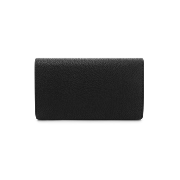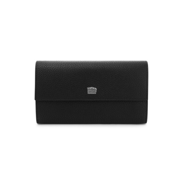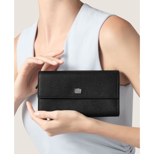 Un portafoglio capiente ed elegante, realizzato in pregiata pelle di vitello goffrata nera. Il modello è progettato per mantenere ogni cosa perfettamente organizzata ed offre ben 12 scomparti per carte di credito, due ampie tasche a soffietto per le banconote, una tasca portamonete con chiusura a zip: il tutto è protetto da una patta con chiusura a bottone, che nasconde anche una tasca supplementare. Questo prodotto rappresenta la massima eccellenza artigianale che da sempre contraddistingue il brand Giovanni Raspini, ed è impreziosito da un caratteristico elemento in Argento 925, realizzato in fusione a cera persa e raffigurante il logo del brand in miniatura, sovrastato dall'iconico coccodrillo. Lavorato interamente a mano in Toscana.