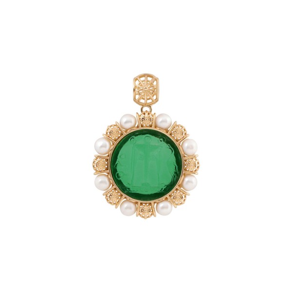 Ciondolo in oro 9 kt con pasta vitrea taglio tondo contornata da perle. Sulla pasta vitrea è inciso il tripode, legato ad Apollo delfico e ai miti della fondazione della città di Kroton, icona della Magna Grecia.
