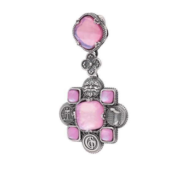 Ciondolo Gerardo Sacco pendente, dall’accattivante linea geometrica. I colori sfaccettati delle pietre sapientemente alternati ai simboli della Magna Grecia.